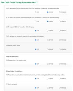 To ensure that your vote is counted, irrespective of whether or not you attend the AGM in person, we encourage all members/shareholders to complete and return a proxy instruction. If you decide to proxy your vote to The Celtic Trust, then use ‘an officer of The Celtic Trust’ in the relevant section, as is shown in the instructions. Votes cast online or by post will be counted provided they are received by 10.30am on Thursday 20 November 2025. Register your vote online by visiting: www.investorcentre.co.uk/eproxy